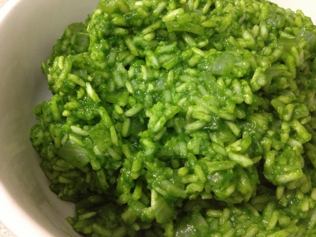- Додати курячий бульйон. Після того як рис вбере весь бульйон, додати зелений соус.