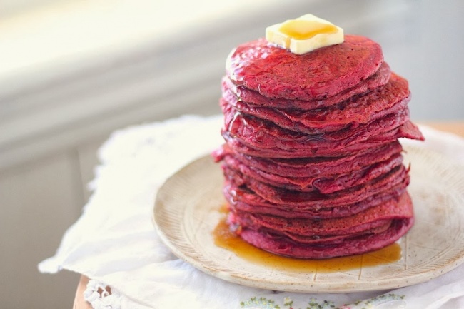 Оладки ніжно-рожевого кольору особливо гарні будуть з ягодами або фруктами.