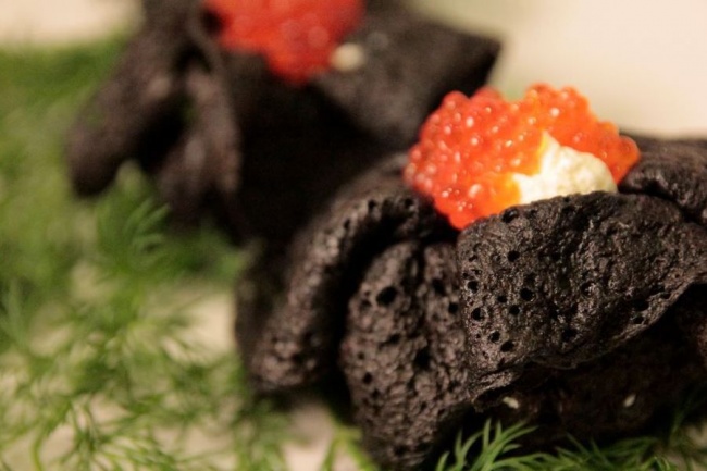 Незважаючи на колір, чорні млинці надзвичайно смачні. Правда, для приготування доведеться обзавестися чорнилом каракатиці, але що не зробиш заради ефекту!