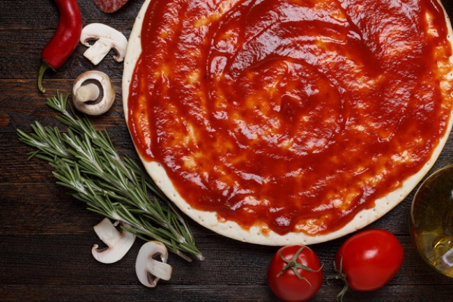 Для піци середнього діаметра додаємо не більше 3 столових ложок соусу. В якості соусу використовуємо не тільки традиційну томатну пасту, але і ніжний вершковий сир, хумус, кабачкову ікру або соус песто. Стежимо за консистенцією соусу: він не повинен бути рідким, інакше тісто «попливе».
