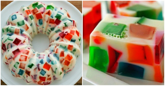 - Кольорове желе нарізаємо кубиками, засипаємо їх довільно у відповідну форму і заливаємо згущеним молоком з желатином. Залишаємо застигати в холодильнику.
