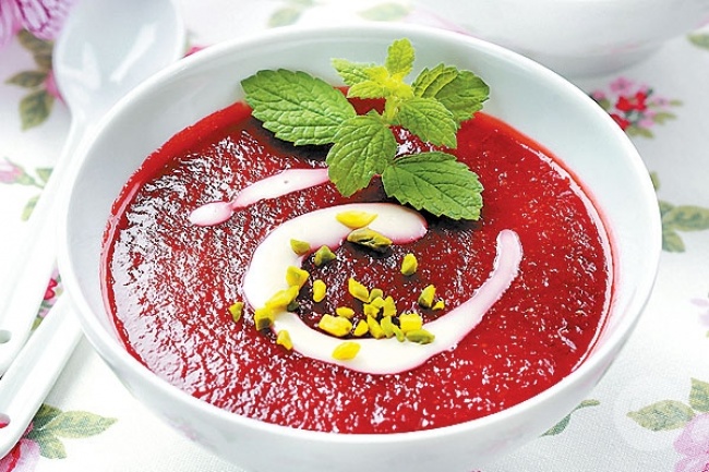 - Перед подачею посипте полуничний суп подрібненими фісташками і прикрасити листочком м'яти.