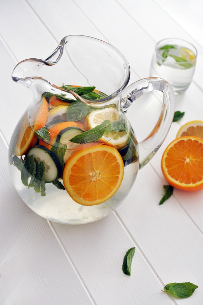 Апельсини, лимон і огірок нарізати, покласти в глечик, залити водою. Трохи придушити фрукти, щоб вони віддали більше смаку. М'яту подрібнити, додати в глечик.