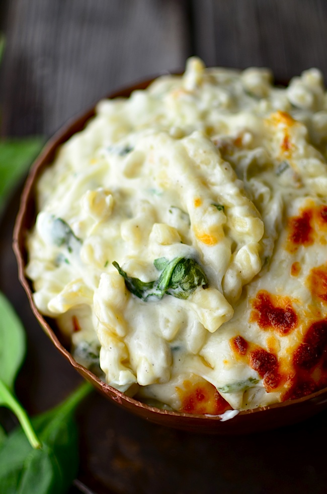 Розігрійте духовку і в каструлі зваріть макарони відповідно до інструкції на упаковці. Зберіть у великій мисці по половині чашки свіжих артишоків і нарізаного шпинату, цибулі, 3 зубчики часнику. Додайте тертий сир пармезан, 1 чашку сиру моцарелла, 1 склянку тертого швейцарського сиру і вершковий сир. Перемішайте це все зі звареними макаронами, покладіть у змащену форму, додайте вершки і випікайте близько 30 хвилин.