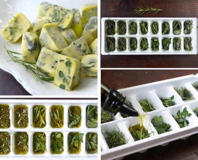 - Помістіть свіжу зелень у форми для льоду, залийте оливковою олією і поставте в морозилку. У такому вигляді зелень відмінно зберігається, і її можна додавати у страви прямо в кубиках.