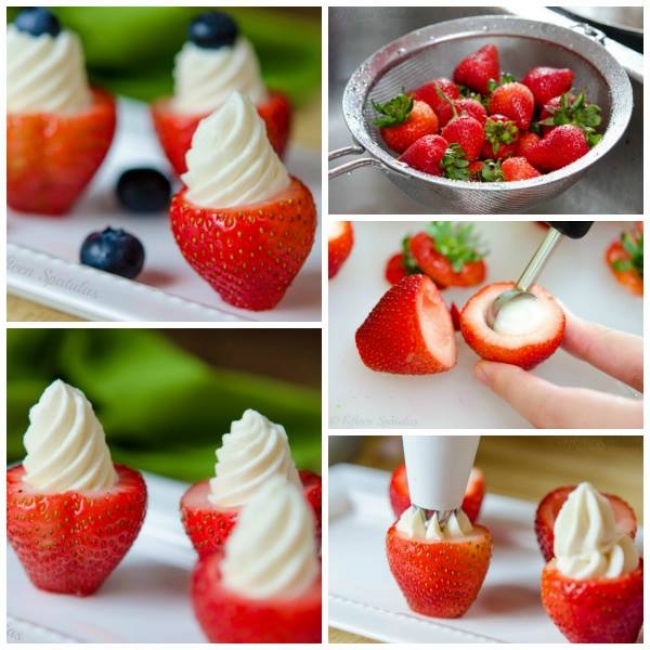 - Прибираємо з полуниці серцевину, заповнюємо її збитими вершками або кремом — і десерт готовий.