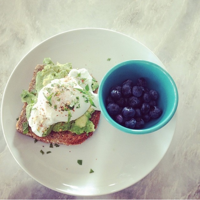 Тост зі злаками, пюре з авокадо і смажене на повільному вогні яйце. Все це приправити свіжими травами і червоним перцем. Чорниця і трави — прекрасні антиоксиданти, а червоний перець стимулює систему кровообігу.