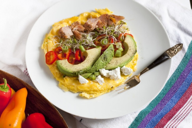 До звичного нам усім ранкового омлету можна додати авокадо і шматочки лосося. Ситний і багатий білками сніданок.