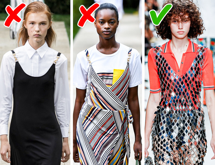 Сорочки під сукнею більше не актуальні, а бренд Miu Miu і зовсім заявляє, що і самі сукні — вчорашній день, пропонуючи їм на заміну сарафани, які більше схожі на шкільні. Що стосується дуету футболки та сукні, то такий варіант можливий, якщо ви надягнете поло. У 2020 році теніску радять носити у всіх можливих варіаціях: під сукнями й поверх, зі строгими костюмами або, як на шоу Paco Rabanne, під кольчугою.