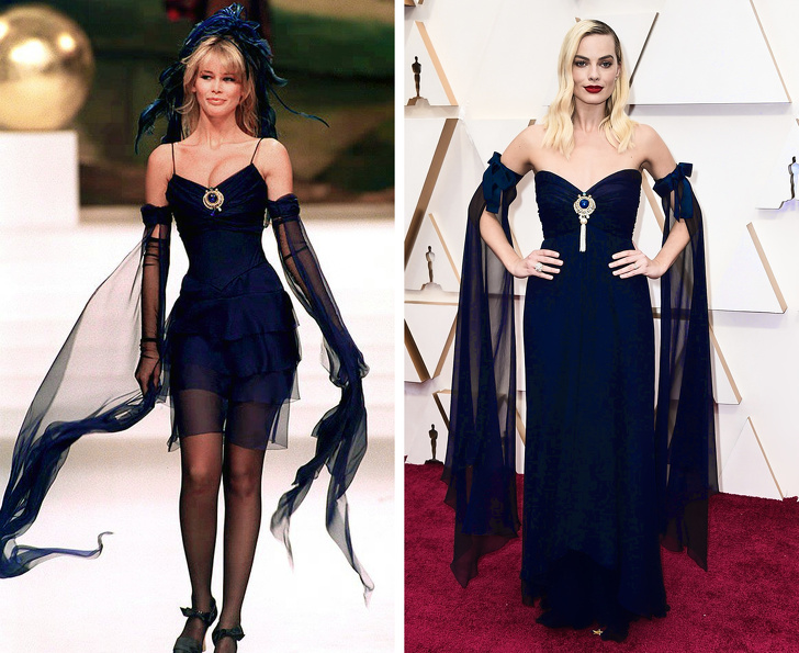 Актриса і її стиліст задовго до церемонії вирішили, що на червону килимову доріжку Роббі вийде у вінтажному сукню. Вибір припав на колекцію Chanel 1994 року. Плаття на Марго дуже схоже на те, яке демонструвала на подіумі Клаудія Шиффер. Але це інший наряд, у свій час він був зшитий за спеціальним замовленням для клієнта. При цьому основні елементи дизайнерського рішення впізнавані: прикрашені бантами рукави, які нібито існують самі по собі, брошка з круглим лазуритом на бюст'є і глибокий синій колір.