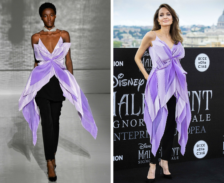 Анджеліна Джолі вирішила не підкреслювати область шиї масивним намистом, як це було зроблено на показі. В іншому подіумний образ повторюється один в один. Ми знаходимо, що актрисі дуже йде цей ефектний топ різних відтінків бузкового. А ви як думаєте?