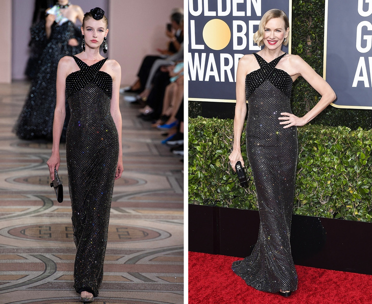 Блискуче плаття, що підкреслює контури фігури, — це справжня голлівудська класика. І треба визнати, що Наомі Уоттс просто бездоганна в цьому вбранні, який ідеально доповнили золоті локони і червона помада.