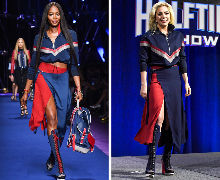 Леді Гага практично один в один повторила подіумний образ. І на наш погляд, цей наряд в стилі спорт-шик виглядає однаково ефектно і на моделі, і на співачці.