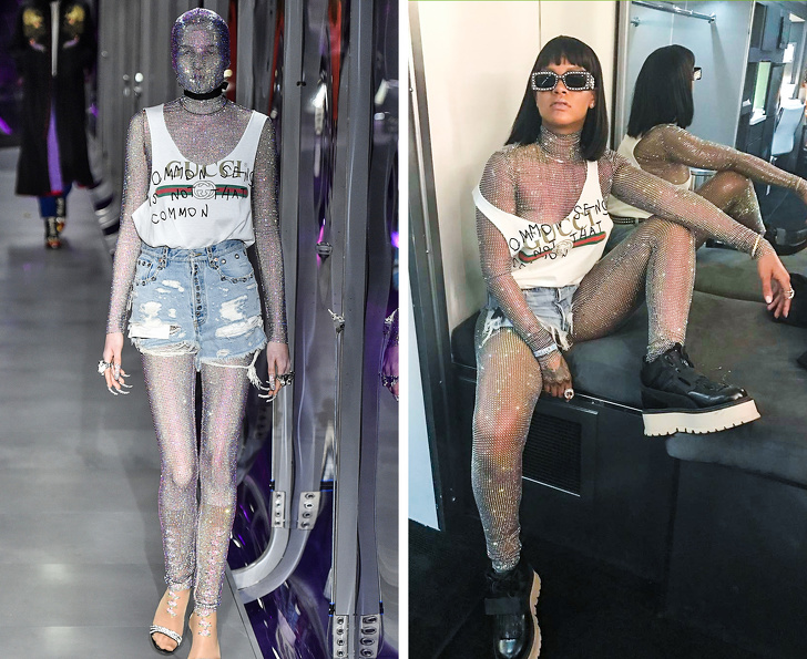 Наряд виглядає однаково епатажно і на моделі, і на співачці. Але все-таки добре, що Ріанна вирішила не вдягати цей своєрідний головний убір.