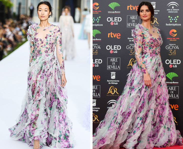 Треба визнати, що кутюрну сукню, ліф якого виконаний з напівпрозорої сітки, розшитій фантазійними квітами, виглядає на іспанською актрисою просто приголомшливо. І підкреслює її жіночні форми.