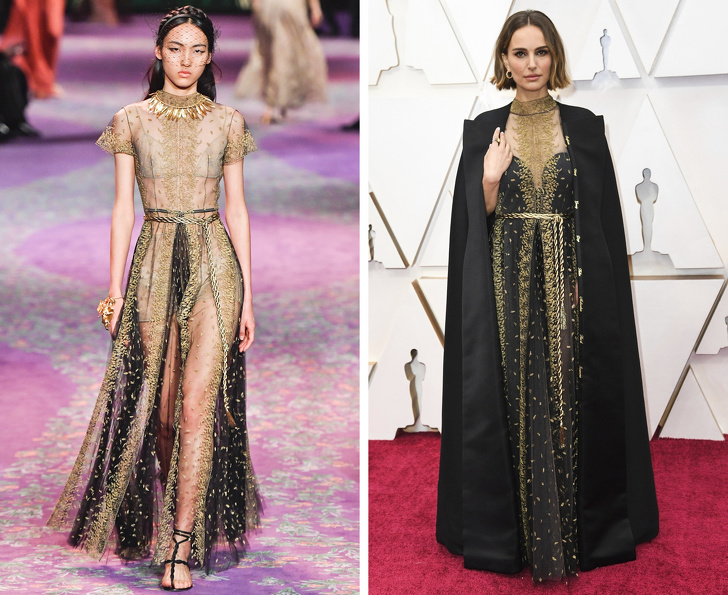 Сукні Dior Couture з чорно-золотою вишивкою, на відміну від представленого на подіумі, було одягнуте актрисою на щільне чорне боді. На плечі Портман накинула кейп з вишитими на ньому іменами жінок-режисерів, які не отримали номінації на «Оскар». Ось такий образ-висловлювання.