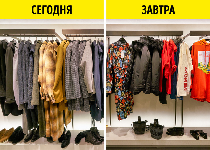 Коли йде розпродаж, речі в магазині дуже часто міняють місцями. Це робиться для того, щоб у покупців створювалася ілюзія, що колекції оновлюються. Чим ближче до кінця сезону знижок, тим далі в кінець залу йдуть більш дешеві речі. Біля входу починають розташовувати дорожчі товари — новинки зі свіжої колекції.