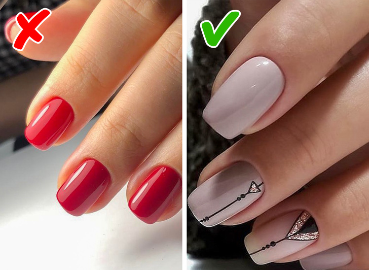 Ми звикли до того, що класичний колір лаку для нігтів — яскраво-червоний. Але, на жаль, це не кращий вибір: він, як і всі холодні відтінки червоного, підкреслює недоліки шкіри рук. Те ж відноситься і до темним тонам. Якщо все ж хочеться використовувати таку гаму кольорів в манікюрі, можна зробити на парі нігтів актуальний геометричний візерунок, а в якості основного кольору — вибрати нейтральний бежевий або молочний.