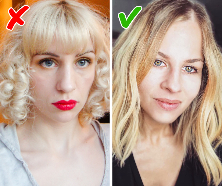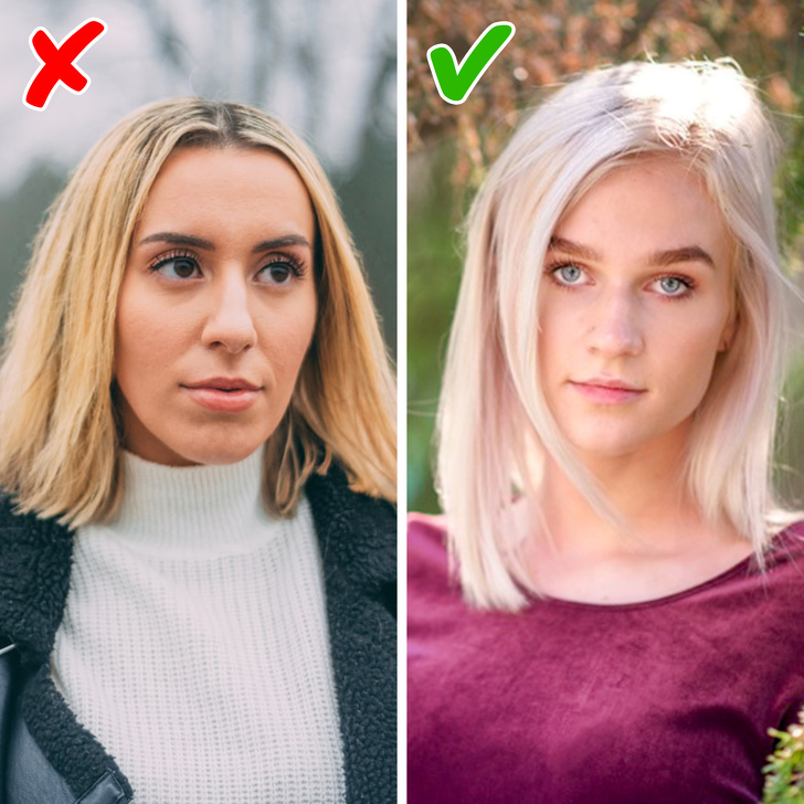 Занадто темне волосся можуть створити навколо особи ореол, який підкреслить всі вікові зміни. Повне знебарвлення з нальотом жовтизни — теж не кращий вибір: воно змушує волосся виглядати недоглянутими і перепаленими. Якщо вам хочеться експериментів з кольором, краще всього підібрати відтінок на два тони світліше натурального або ж зробити вибір на користь благородного холодного блонда.