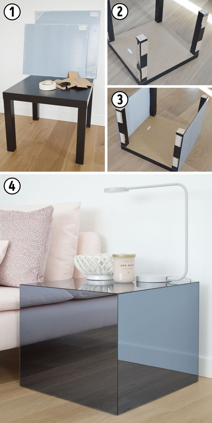 Провести подібне удосконалення журнального столика насправді простіше, ніж здається. Для цього нам потрібні звичайний стіл, 5 стандартних акрилових дзеркал з IKEA, картон і двосторонній скотч. Далі необхідно дотримуватися інструкції: