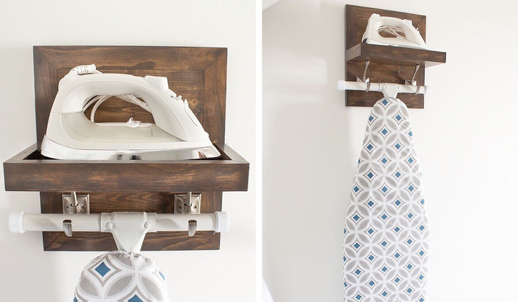 Досить прибити поличку на рівні грудей, закріпити на неї пару масивних крючков, та тримач для прасувальних приладдя готовий.