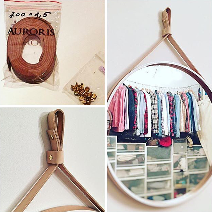 Кругле дзеркало настінне можна зробити більш стильним. Для цього використовуємо широкий шкіряний ремінь, яким потрібно обернути раму, приклеївши його до неї. Кінці ременя можна скрутити як вам завгодно, щоб закріпити їх на гачку.