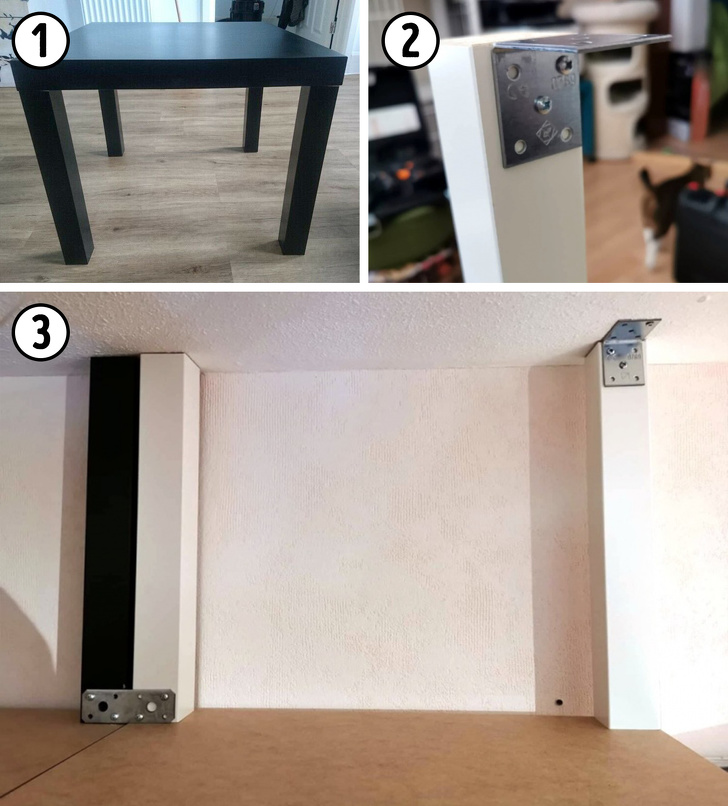 Перш ніж робити такий будиночок для котів, варто переконатися в тому, що він достатньо міцний і здатний витримати вагу ваших вихованців. Далі, як це показано на картинках, з'єднайте столи між собою, прикрутіть кронштейни до кожної з ніжок, а потім всю конструкцію прикріпіть до стелі.