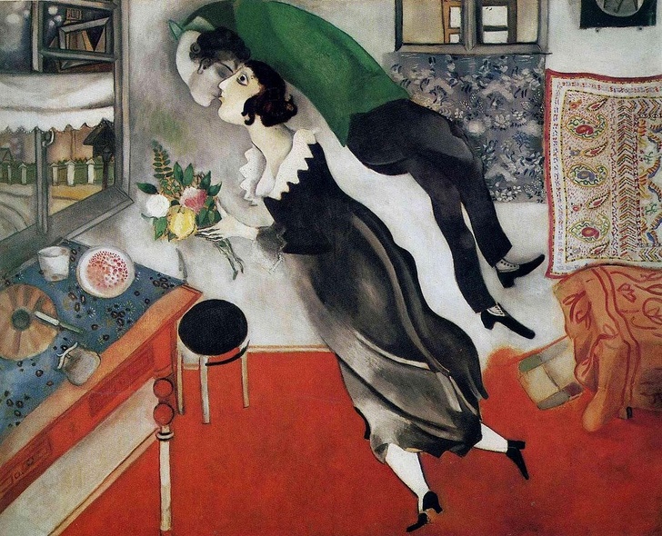 Чоловік злітає під саму стелю, він закидає голову жінки і дуже ніжно шепоче їй щось на вухо. Закоханим хочеться вилетіти крізь вікно у величезний безмежний світ. Саме так Марк Шагал бачив свою любов з Белою Розенфельд. І навіть після своєї смерті від сепсису Белла залишилася головною музою для художника. Крокував відмовлявся говорити про неї як про померлу.