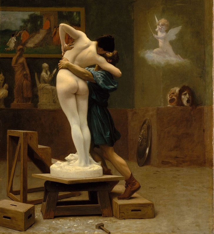 Французький художник зобразив на полотні один з найпопулярніших античних міфів: скульптор Пігмаліон закохався у свою статую Галатеї. Своїм поцілунком він оживив статую. Але Галатея так і залишається для Пігмаліона чимось недосяжним. Статуя стоїть вище скульптора, і для того, щоб подарувати їй свою любов, Пігмаліон повинен піднятися до її рівня.