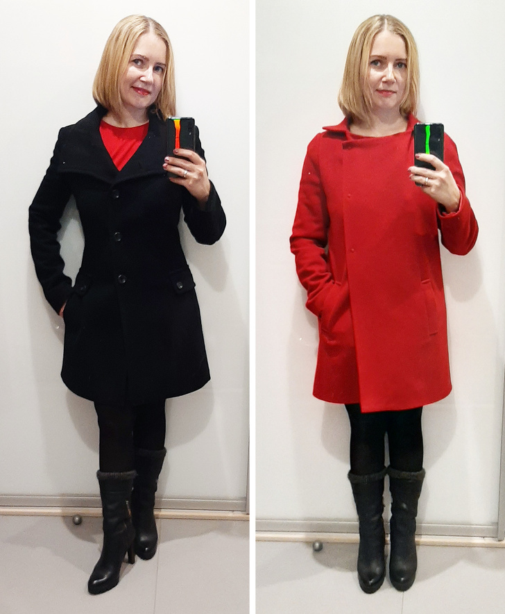 Дійсно, в прямому пальто фігура не виглядає витонченою. Тому, коли мені хочеться виглядати більш жіночно, я одягаю чорне приталене пальто.