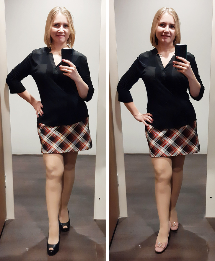 Я приміряла чорні і бежеві туфлі: у чорних каблук в 2,5 рази вище, але в бежевих ноги дійсно виглядають краще.