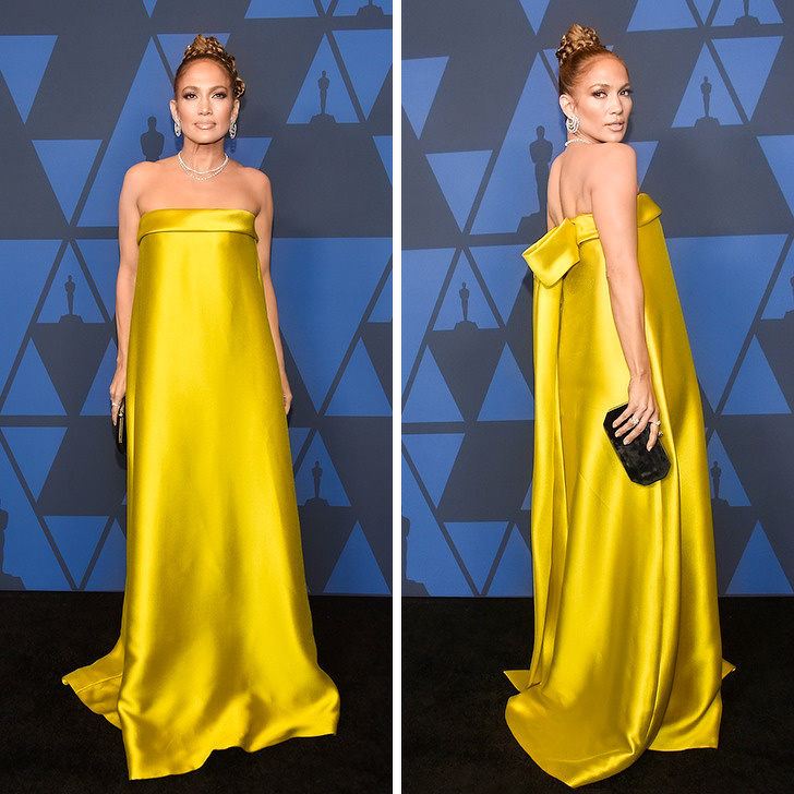 У цьому струмує яскравому сукню Джей Ло відвідала Бал губернаторів в Голлівуді. Простий крій вбрання компенсував об'ємний бант на спині.