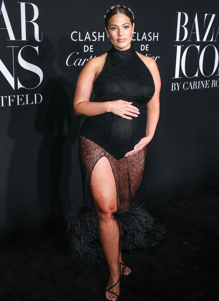 Вагітна модель — завсідник світських заходів. Для виходу вона вибирає сміливі або навіть пікантні вбрання, як це плаття з прозорою спідницею і пір'ям.