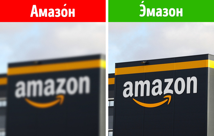 Американська компанія Amazon названа на честь самої повноводної річки в світі Амазонки. В англійському варіанті наголос у цьому слові падає на перший склад, так що і назва компанії слід вимовляти відповідним чином.