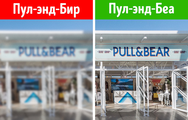 Іспанський бренд повсякденного одягу Pull & Bear носить англомовне назву і перекладається як «натягуй і носи». Літера r на кінці Bear не читається.