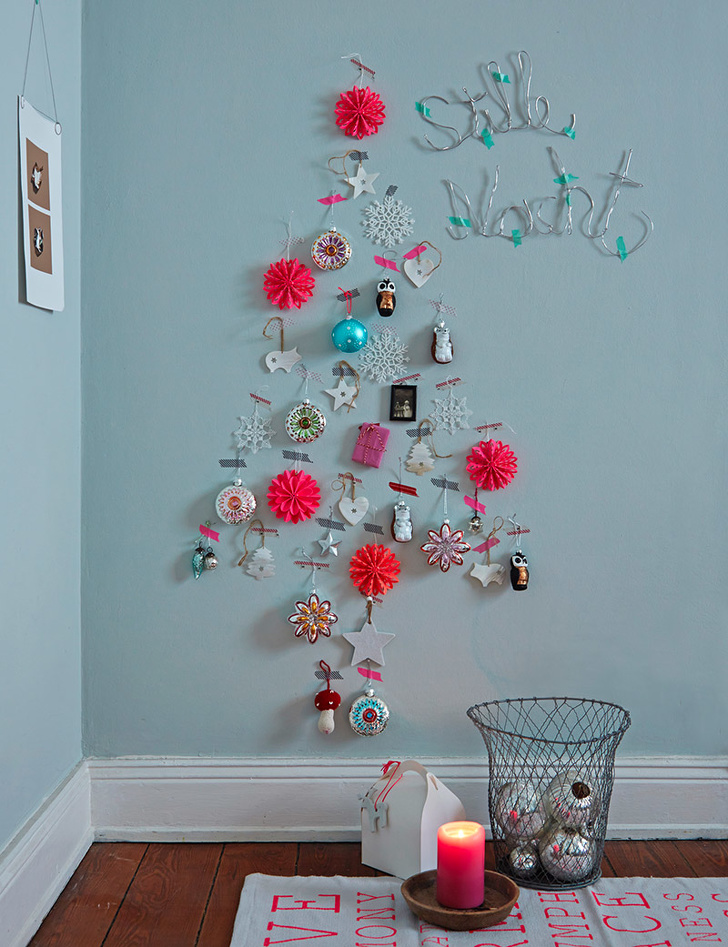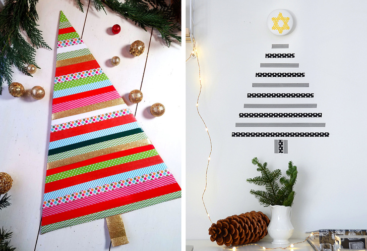 Щасливчикам з миючими стінами практично нічого і робити не треба — лише взяти і скласти ялинковий силует з іграшок, просто наліпивши їх кольоровим скотчем.