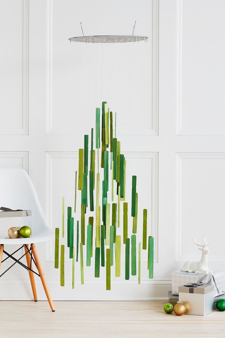 Цій ідеї вже не перший рік, але ширяють у повітрі ялинкові кулі досі зачаровують нас. Щоб бути оригінальним, на цей раз можна відмовитися від іграшок на користь звичайних паличок для розмішування фарби.