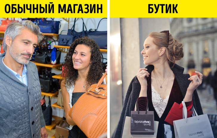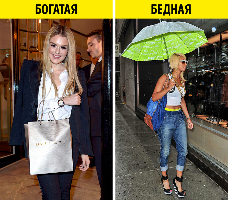 Одяг може бути і небрендового. А от якщо є дорогі годинники, значить, клієнт може дозволити собі витратити значну суму в бутіку, і тоді підвищену увагу продавців йому забезпечено. Якщо заходить покупець з парасолькою, співробітник торгового залу буде не так старанний, адже при бутиках є криті стоянки, а парасольку говорить про те, що машини у клієнта немає. Отже, речі в магазині йому не по кишені.