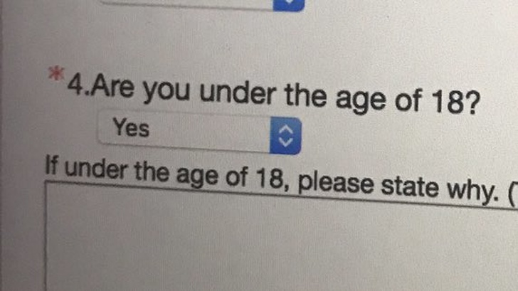 «„Ви молодше 18?“ — „Так“. — „Якщо так, будь ласка, вкажіть чому“».