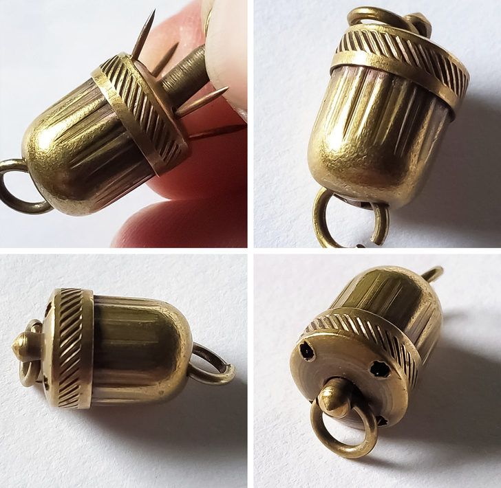 Відповідь: Це досить рідкісний предмет кінця XIX століття, який не дає вкрасти годинник з кишені. Один кінець жолудя прикріплюється до годинника, а інший — до внутрішньої частини кишені. Якщо злодій потягне за кільце, щоб вкрасти годинник, шипи уп'ються йому пальці.