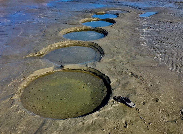 Відповідь: Ці сліди залишилися від обладнання для дослідження чисельності молюсків. Ось як воно виглядає. Фахівці підраховують кількість молюсків в районах виміру і дізнаються їх середнє число на всьому пляжі.