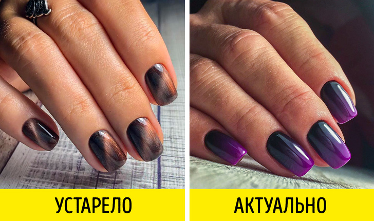 Для створення переходу з одного кольору в інший у цьому сезоні використовуються не яскраві і контрастні, а близькі відтінки. Майстри віддають перевагу класичним фактурами, дрібні блискітки і ефект котячого очі втрачають актуальність.