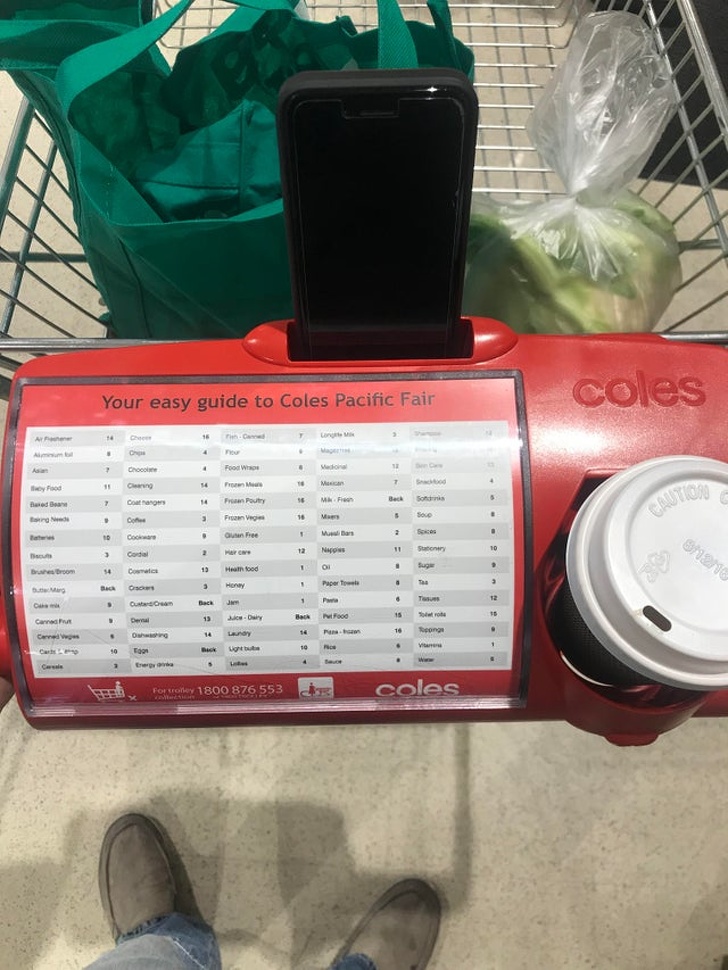 10. У цьому візку є тримачі для склянки та смартфона, а також путівник по відділам супермаркету