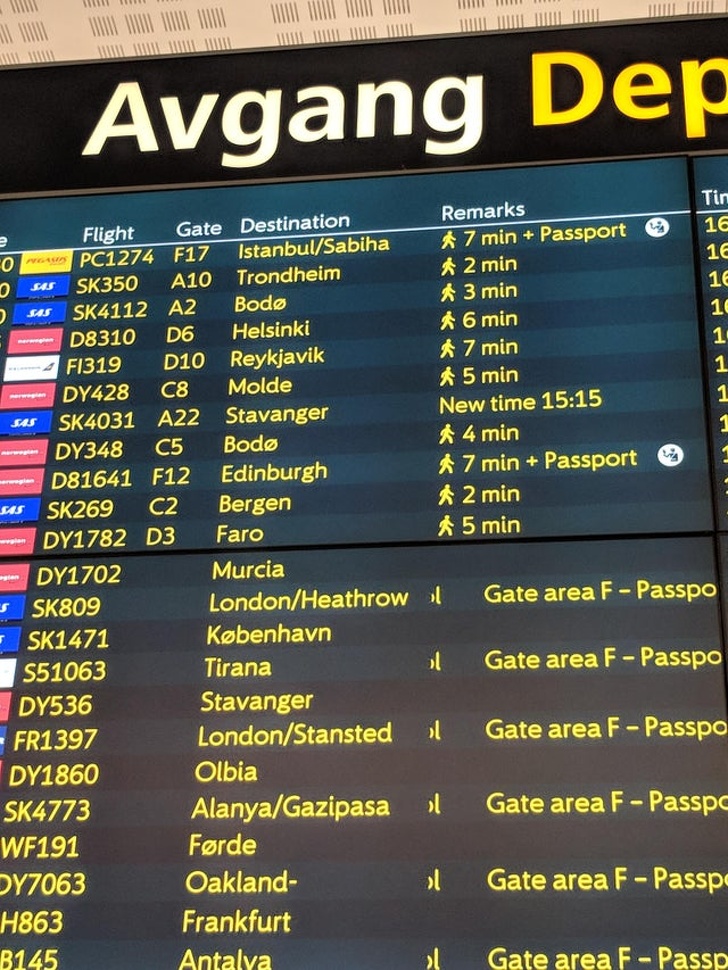 2. Це табло в аеропорту Осло показує, скільки хвилин займе шлях до виходу на посадку
