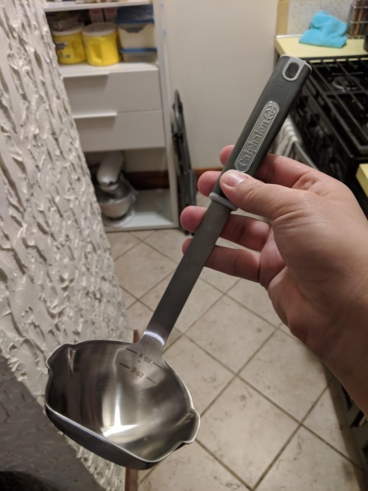 4. «Мій улюблений ополоник: нержавіюча сталь, мірні мітки, плоский край, щоб зачерпнути все з дна, бічні носики для зручного наливання»