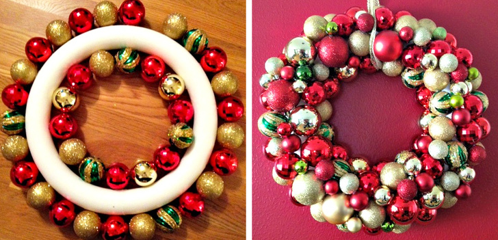 Не всі прикрашають будинки і двері цим атрибутом, але при бажанні ви можете зробити власний вінок за допомогою будь-якого круглого обідка і старих ялинкових кульок. (Покрокову інструкцію можна підглянути тут.) Погодьтеся, виходить дуже ефектно.