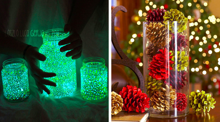Або ж можна проявити більше креативу і наповнити ємності розфарбованими шишками, ялинковими іграшками, які не помістилися на ялинці, або навіть створити разом з дітьми чарівні світяться баночки, ніби наповнені сотнями світлячків (роль яких насправді виконує люмінесцентна фарба). Детальніше про останньої ідеї ви можете почитати тут.