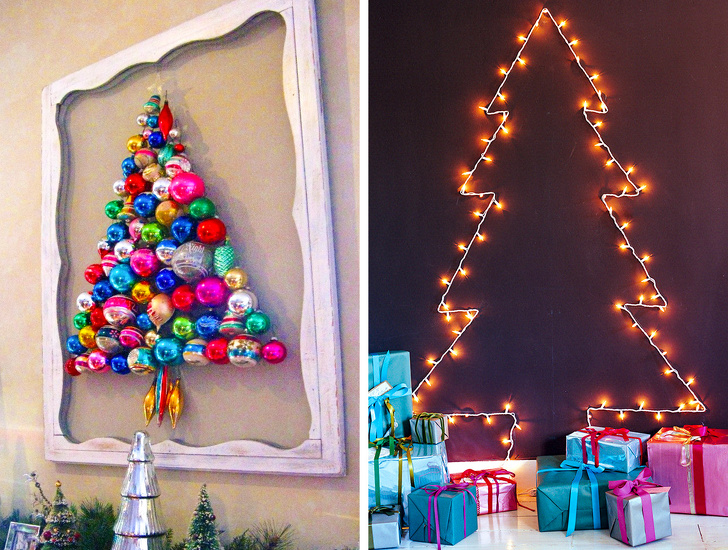 Якщо ж основна проблема для вас полягає у відсутності вільного простору, але без ялинки свята ви не уявляєте, то можна сміливо використовувати стіни. Придивіться до варіантів, представлених вище (але ними, звичайно, способи та ідеї не обмежуються).