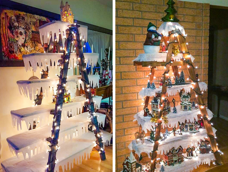 А це варіанти для тих, кому і в цілому традиційна ялинка здається пережитком минулого. Існує величезна кількість замін. Вище, наприклад, представлені варіанти оформлення (вгадайте чого)... звичайної сходів. Сходинки прикрашаються білим папером, вирізьбленою в формі звисаючих снігових заметів, а поверх встановлюються всілякі фігурки, прикраси або подарунки.
