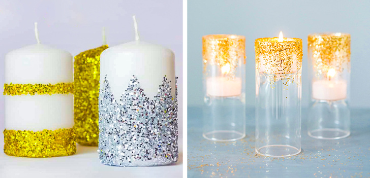 А вже оформлення свічок — і зовсім нескінченне поле для дизайнерської фантазії. Прикрасити можна як підставки, так і самі свічки, якщо у вашому розпорядженні є великі воскові екземпляри, як на фото зліва.